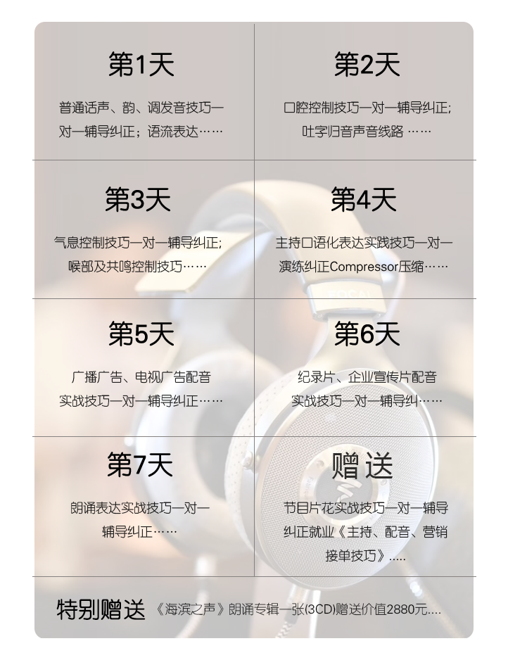 任何一门]艺术都含有它自身的语言,而造成艺术语言的构成。其形态元素主要是:点、线、面。 点:单纯某一知识点。 线:将知识点串联成线;面: 实际操作与应用所涉及的面! 声音艺术高级私教班,8天点、线、面的教学设计,央视顶级设备一对一录音纠正、全方面保障您的学习效果。