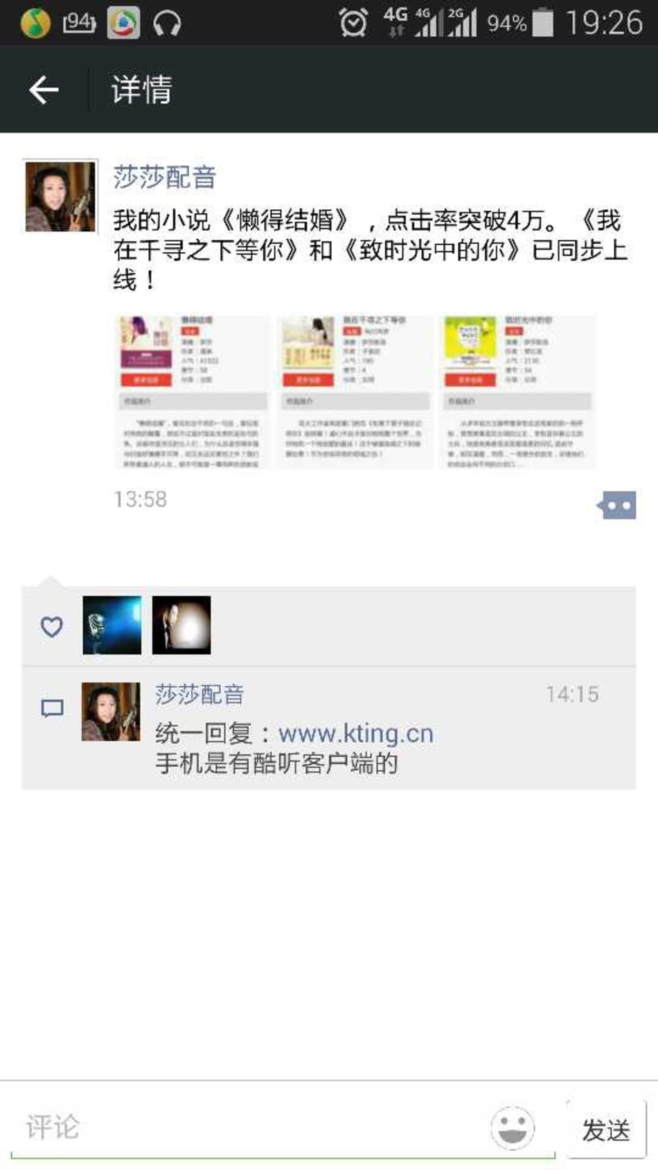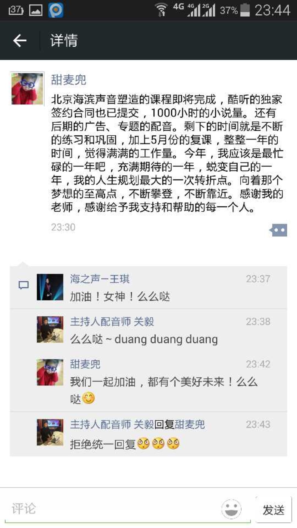 恭喜山东烟台学生-莎莎(甜麦兜),在海滨老师声音塑造私教班学习完后,成功签约北京酷听网,开始接单有声演播!