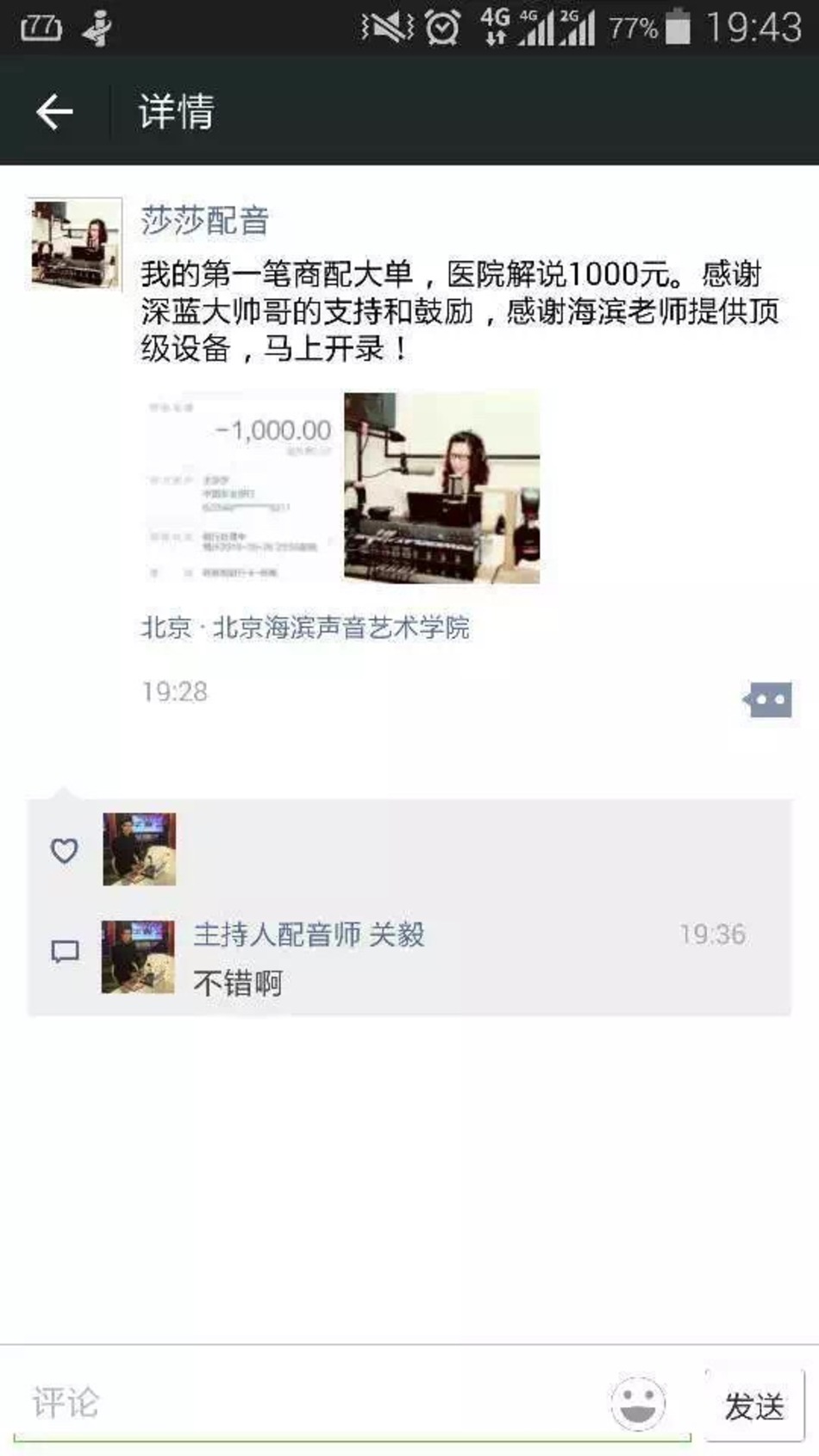 恭喜辽宁学生-Anya,在海滨老师声音塑造私教班学习完后,成功配音接单!每天不断收入!