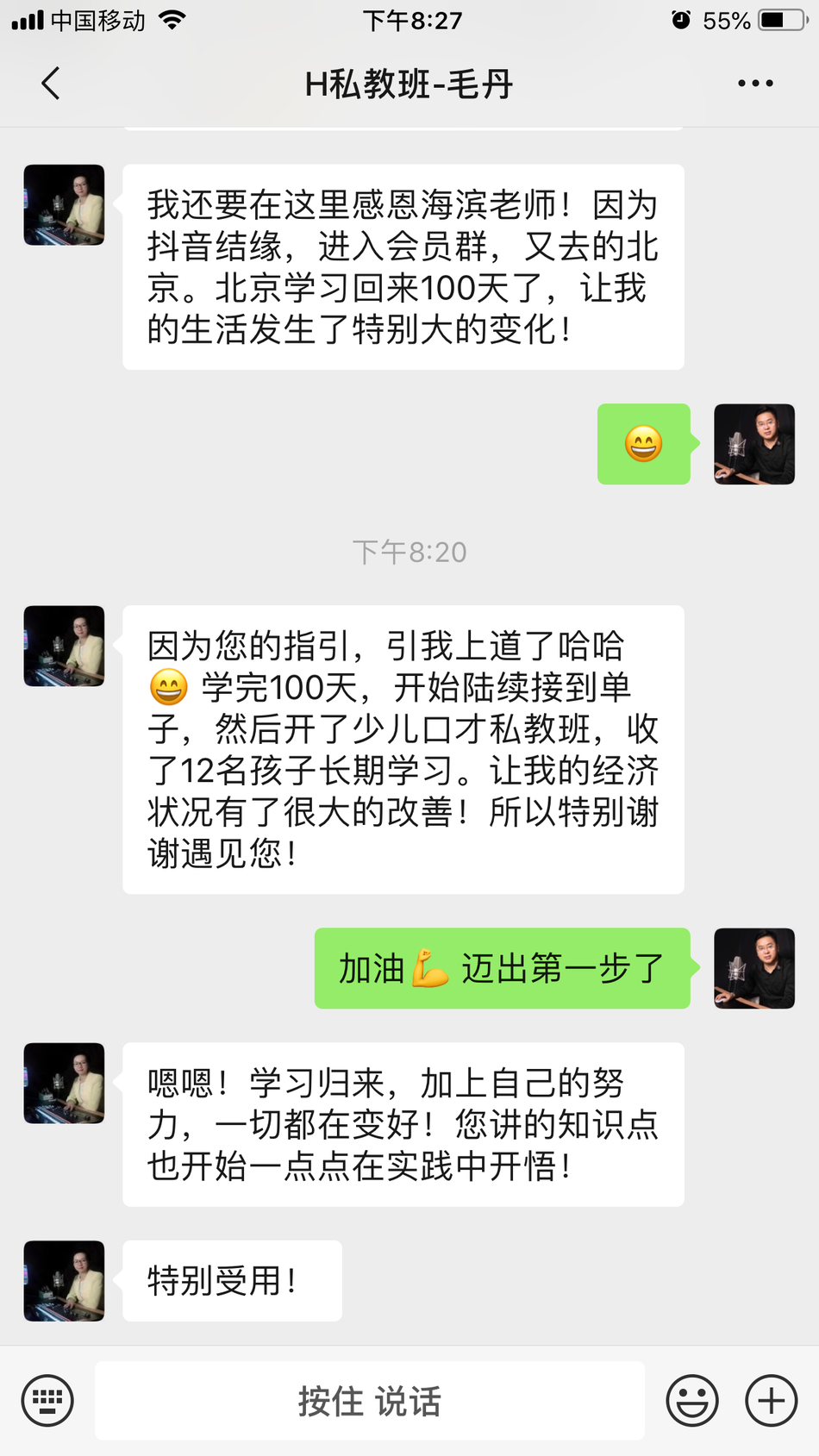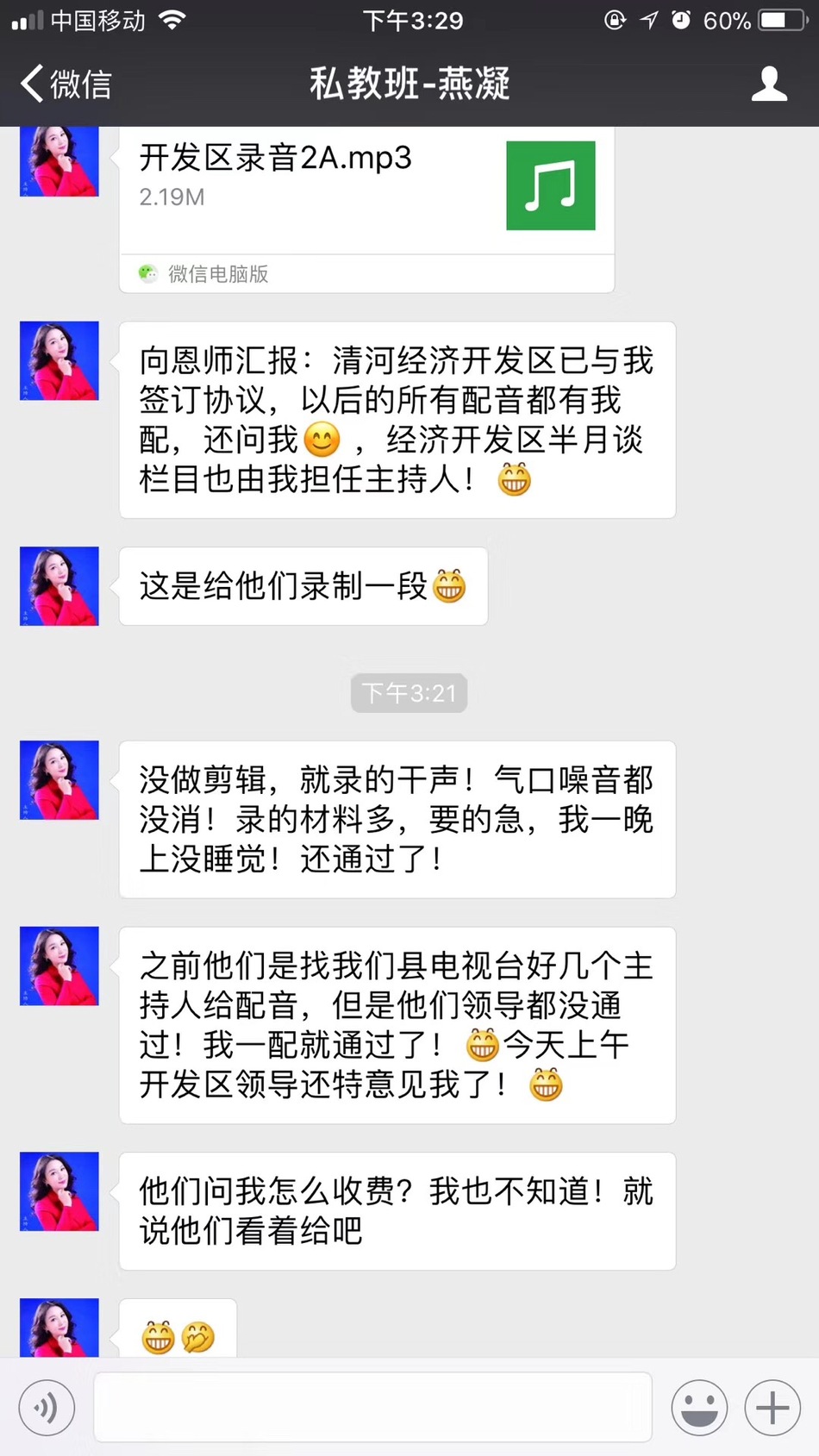 恭喜河北邢台学生-燕凝,在海滨老师声音塑造私教班学习完后,成功配音接单!并开办青少年口才培训机构!