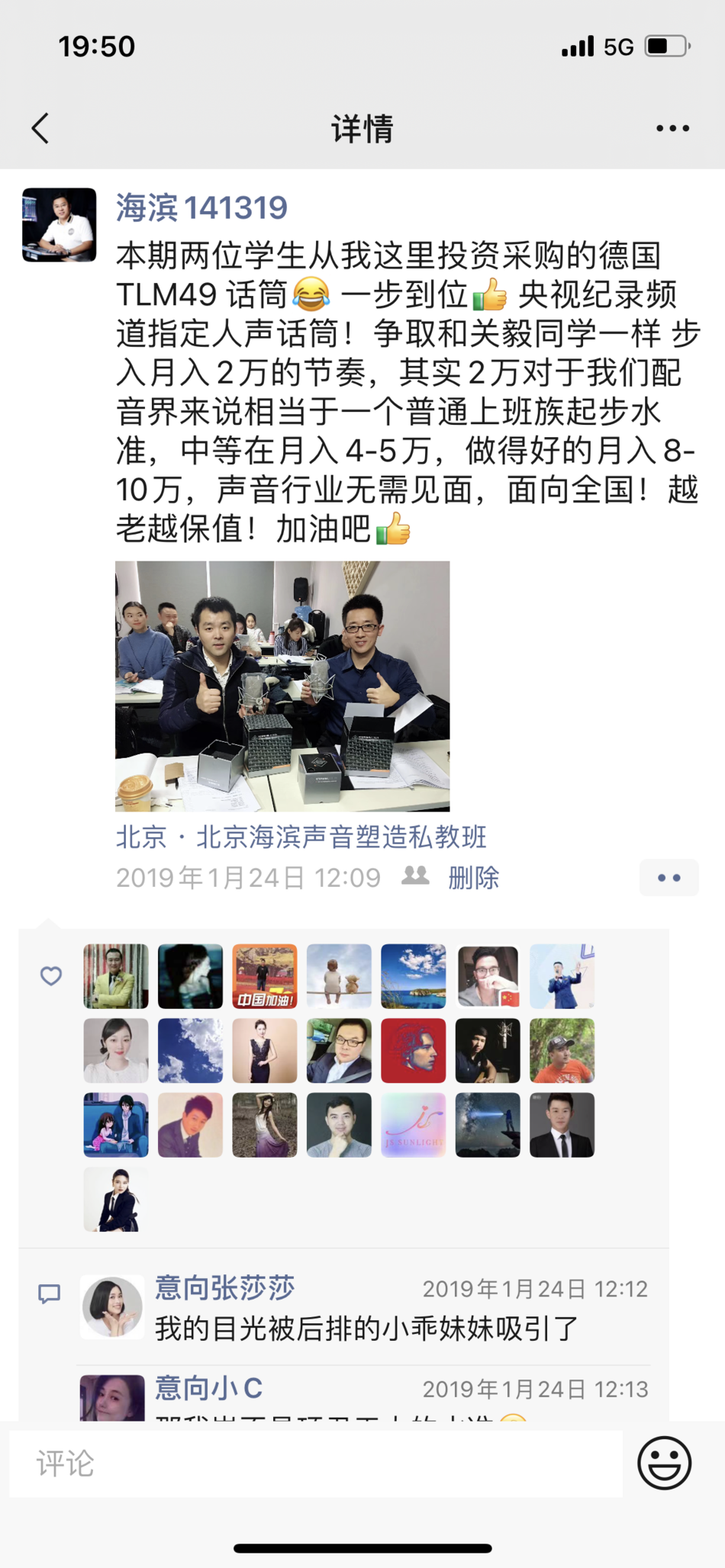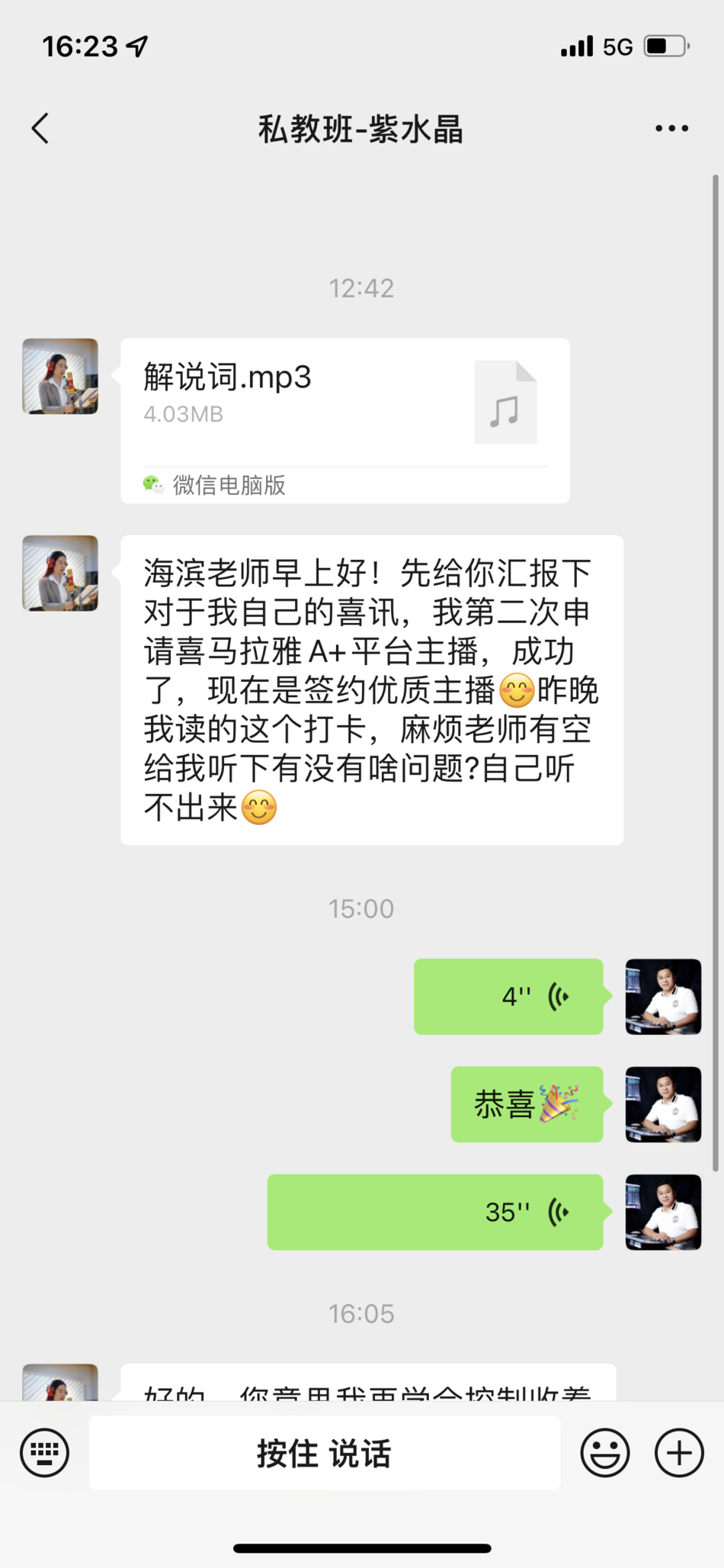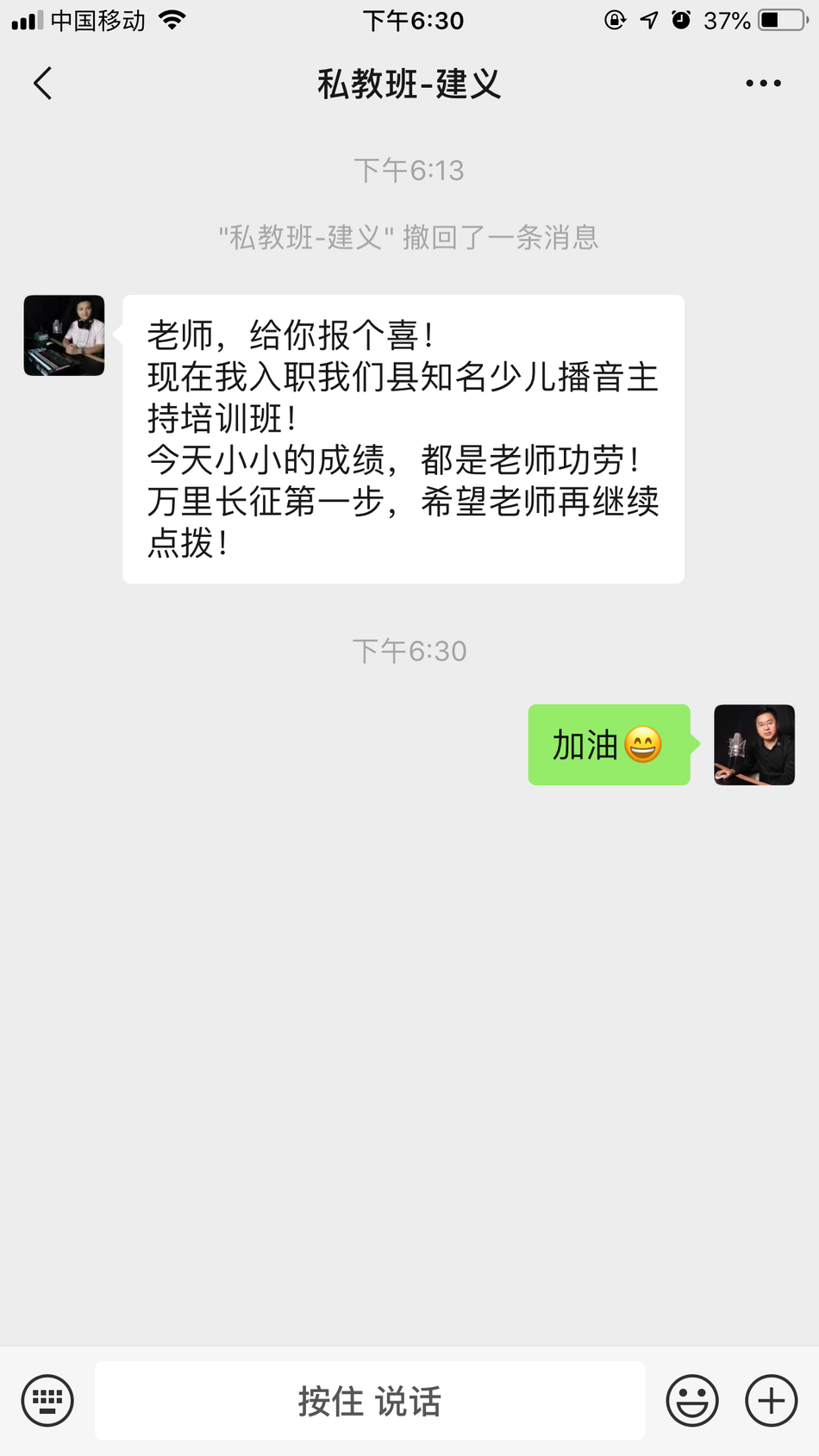 恭喜山东临沂学生-建义,在海滨老师声音塑造私教班学习完后,具备专业级水平,成功应聘口才培训讲师!